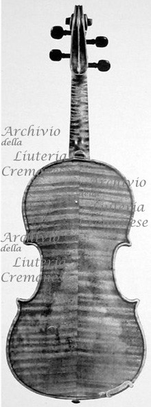Fondo in due pezzi d'acero riccio a marezzatura larga, incollati a spina di pesce con apice in alto.