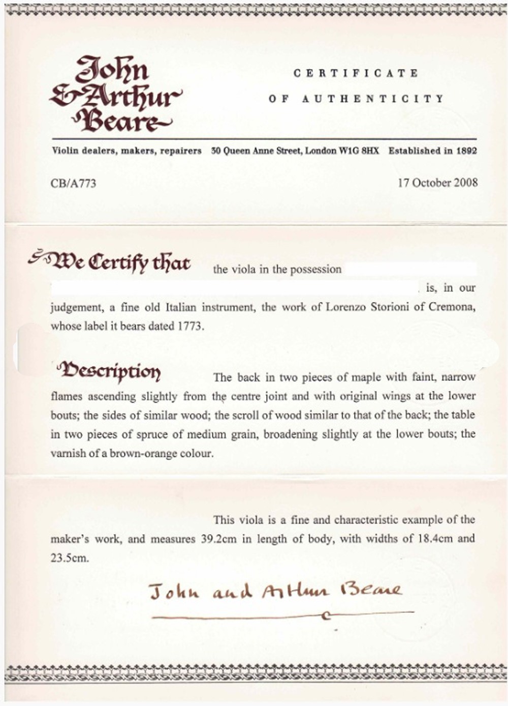 - Laurentius Storioni fecit Cremonae 1773