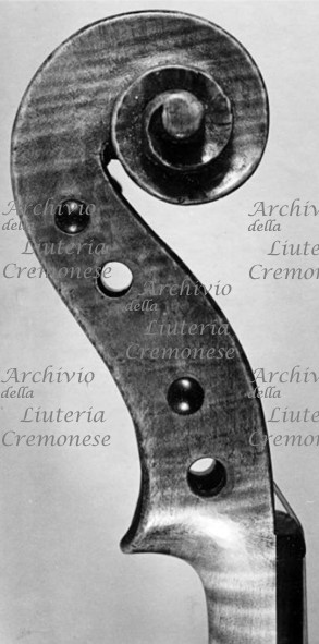 Tavola armonica d'abete a vena media che si allarga verso i fianchi. Fondo in due pezzi d'acero riccio a marezzatura media, incollati a spina di pesce con vertice in basso. Fasce e testa di legno simile a quello del fondo. Vernice bruna-arancio.