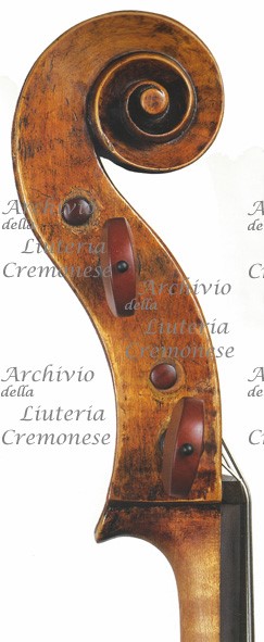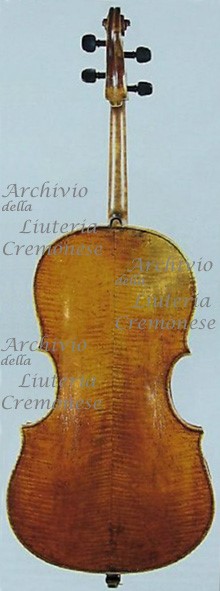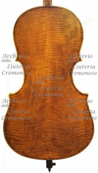 Tavola armonica d'abete a vena da media a larga. Fondo in due pezzi d'acero riccio a debole marezzatura stretta, incollati a spina di pesce con apice in alto, in parte risalente vicino ai bordi. Fasce di legno simile a quello del fondo. Vernice arancio-dorata.