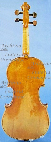 Tavola armonica d'abete a vena media irregolare. Fondo in due pezzi d'acero liscio. Fasce e testa d'acero riccio a marezzatura media. Vernice bruna-dorata.