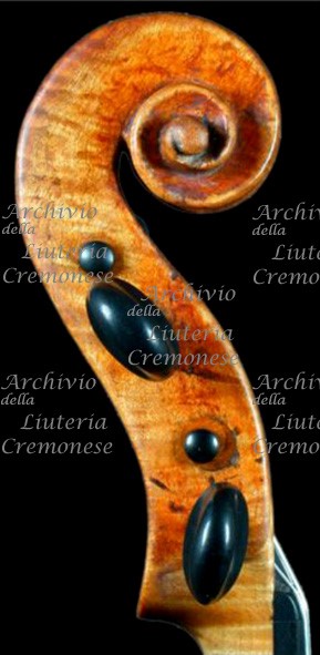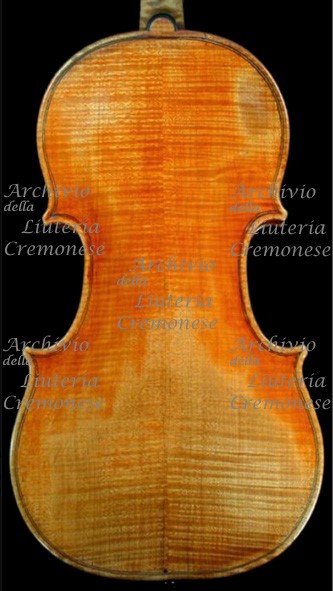 Fondo in due pezzi d'acero riccio a marezzatura stretta, incollati a leggerissima spina di pesce con apice in alto.