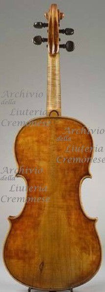 Tavola armonica d'abete a vena media. Fondo in due pezzi d'acero riccio a debole marezzatura media. Fasce e testa d'acero riccio a marezzatura stretta. Vernice bruna-dorata.