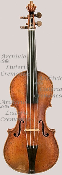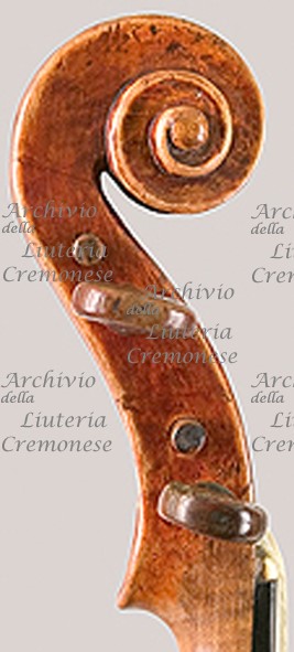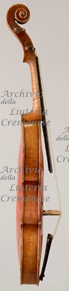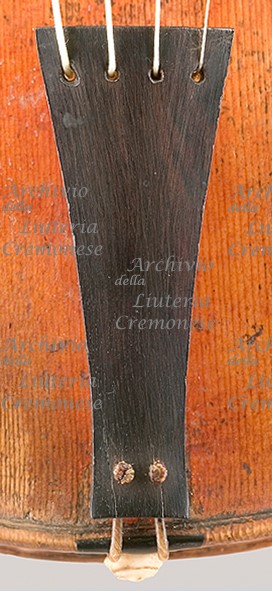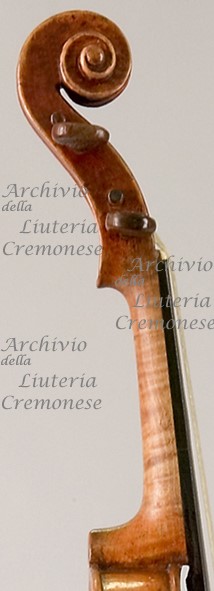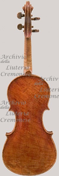 Violino 1/2. Fondo in un pezzo d'acero riccio a marezzatura stretta, irregolare e discontinua, discendente verso destra, con filetti dipinti. Manico e montatura completamente originali: giunzione del manico al corpo, tastiera e cordiera lastronate d'ebano; 4 piroli.