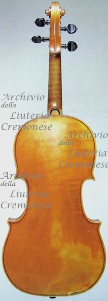 Tavola armonica d'abete a vena media che si allarga verso i fianchi. Fondo in un pezzo d'acero riccio a debole marezzatura larga prevalentemente orizzontale. Fasce d'acero riccio a debole marezzatura ampia. Testa d'acero liscio. Vernice bruna-dorata.