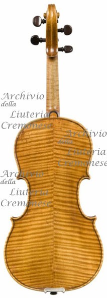 Fondo in due pezzi d'acero riccio a marezzatura media, incollati a spina di pesce con vertice in alto.