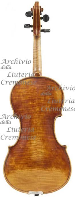 Fondo in due pezzi d'acero riccio a marezzatura media, incollati a spina di pesce con vertice in alto.