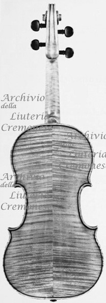 Fondo in due pezzi d'acero riccio a marezzatura media, incollati a spina di pesce con apice in alto.