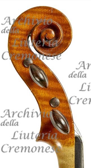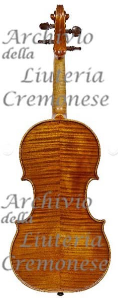 Fondo in due pezzi d'acero riccio a marezzatura media, incollati a leggera spina di pesce con vertice in alto. Marchiato all'interno della tavola "G. Pedrazzini - Milano" e all'interno del fondo "G. Pedrazzini".