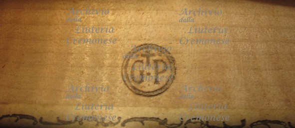 Fondo in un pezzo d'acero riccio a marezzatura media, leggermente discendente verso sinistra, con all'interno il marchio "G.P."