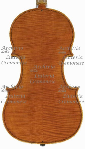Fondo in due pezzi d'acero riccio a marezzatura media-fine, incollati a spina di pesce con apice in alto, marchiato all'interno.