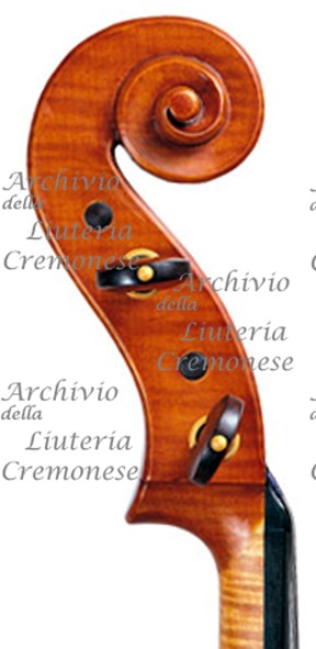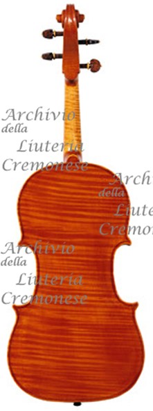 Costruita su modello di Carlo Testore del 1762. Fondo in un pezzo d'acero riccio a marezzatura media, discendente verso destra.