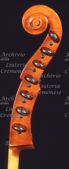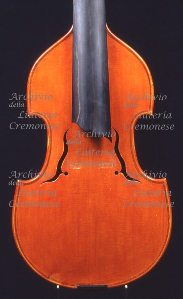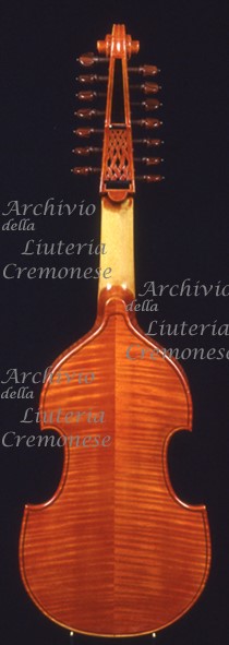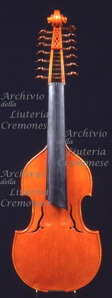 Strumento armato con 7 corde di canto e sette di risonanza. Tavola in due pezzi d'abete rosso a vena abbastanza regolare con fori armonici a forma di fiamma. Fondo in due pezzi d'acero riccio a marezzatura media, incollati a spina di pesce con apice in alto. Fasce di legno simile a quello del fondo. Vernice rossa-bruna.