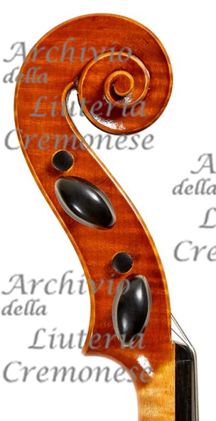 Fondo in due pezzi d'acero riccio a marezzatura media, incollati a spina di pesce con apice in alto.