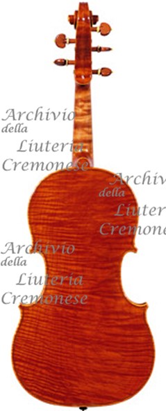 Costruita su modello A. Stradivari del 1672, con fondo in un pezzo di acero conchiglia a marezzatura media quasi orizzontale.
