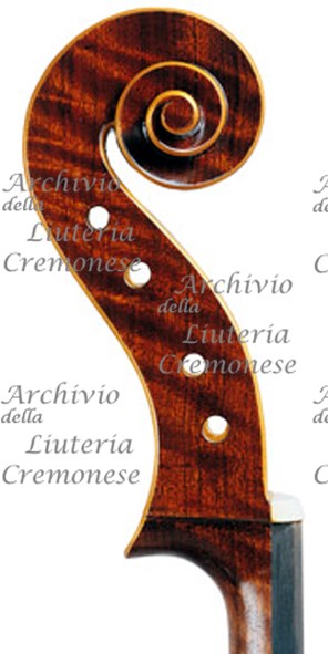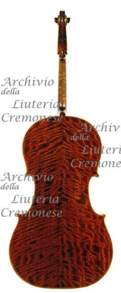 Costruito su modello di A. Stradivari del 1720, ha la tavola armonica di cedro del Cile e fondo in due pezzi di noce moltegna (?), incollati a spina di pesce con vertice in alto.