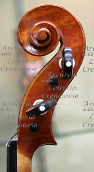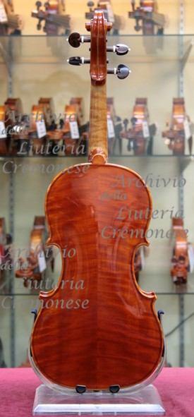 Fondo in due pezzi d'acero riccio a marezzatura larga, incollati a spina di pesce con vertice in alto.
