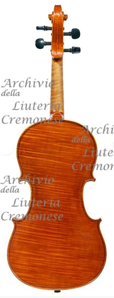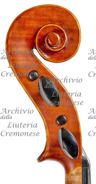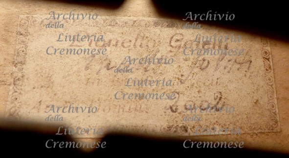 Tavola in due pezzi d'abete a vena media-larga, uniforme, regolare. Fondo in un pezzo d'acero riccio con marezzatura media discendente verso destra, marchiato all'interno. Fasce dello stesso legno del fondo con marezzatura irregolare. Manico e testa d'acero con marezzatura orizzontale. Vernice rosso-arancio su fondo dorato.