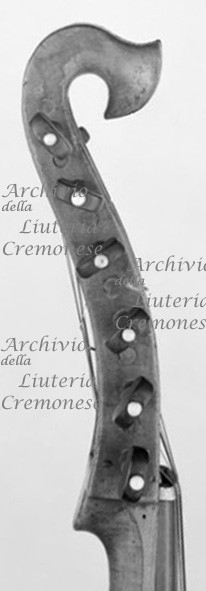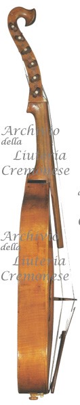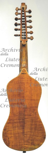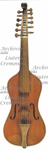 Strumento a forma di 8, montato con sei corde di budello e sei corde metalliche di simpatia. Fondo piatto in due pezzi d'acero riccio a marezzatura media quasi orizzontale, con leggera "gobba" nella parte alta e marchio a fuoco "L S / CREMONA" sulla nocetta. Vernice bruna chiara.