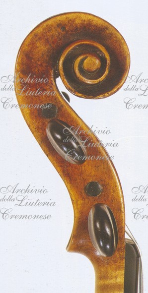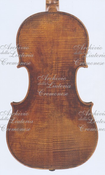 Fondo in due pezzi d'acero riccio a marezzatura media-fine, incollati a spina di pesce con vertice in basso.