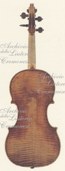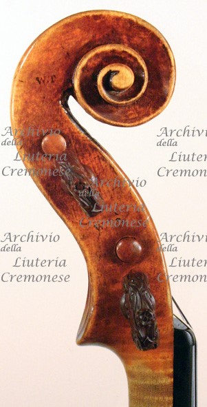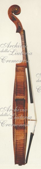 Fondo in due pezzi d'acero riccio a marezzatura fine, incollati a spina di pesce con apice in alto. Testa quasi identica a quella d'un violoncello del 1731 con l'etichetta di Giuseppe filius Andreae.