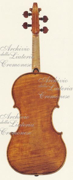 Fondo in un pezzo d'acero riccio a marezzatura larga discendente verso destra. Fasce e testa di legno simile a quello del fondo. Vernice arancio pallido-dorata.