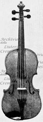 Tavola armonica d'abete a vena media che si allarga verso i fianchi. Fondo in un pezzo d'acero riccio, a taglio tangenziale, con debole e discontinua marezzatura fine e un'aggiunta originale nel lato sinistro. Vernice bruno-dorata.