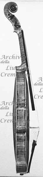 Fondo in un pezzo d'acero riccio, tagliato tangenzialmente, a marezzatura media fiammata discontinua orizzontale. Nel lobo inferiore destro un ampio nodo. Vernice bruno-dorata.