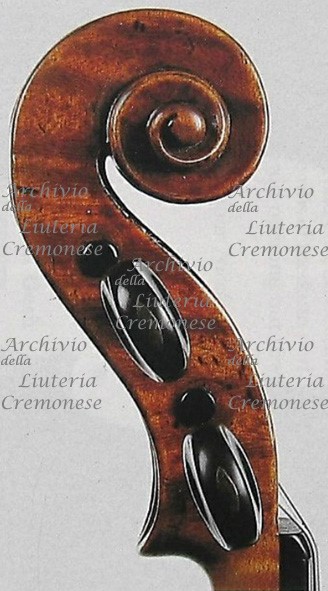 Tavola armonica d'abete a vena fine che si allarga verso i fianchi. Fondo in due epzzi d'acero riccio a marezzatura larga, incollati a spina id pesce con apice in alto. Fasce di legno simile a quello del fondo. Testa d'acero riccio a marezzatura media. Vernice arancio-bruna.