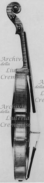 Tavola armonica d'abete a vena media al centro, che si apre leggermente verso i fianchi. Fondo in un pezzo d'acero riccio a marezzatura media leggermente discendente verso sinistra. Fasce e testa di legno simile a quello del fondo. Vernice bruna-dorata.