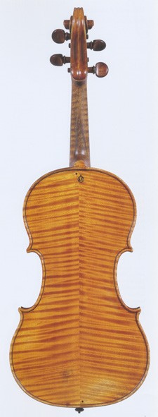 Fondo in due pezzi d'acero riccio a marezzatura ampia, incollati a spina di pesce con vertice in alto.